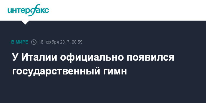 Москва. 16 ноября. INTERFAX.RU - После 60-летнего перерыва Италия вновь обрела официальный государственный гимн, сообщает в среду информагентство ANSA.