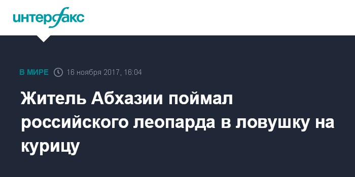 "Около полутора недель назад сельчане заметили пропажу домашней птицы, а три дня назад у одного из подворьев житель села Вадим Хинтба вечером увидел само животное и решил его поймать. Для этого он изготовил специальную клетку-ловушку и в качестве приманки привязал внутри курицу. В итоге 15 ноября он поймал леопарда без каких-либо травм и увечий", - рассказал в четверг "Интерфаксу" директор Института экологии Академии наук Абхазии Роман Дбар.