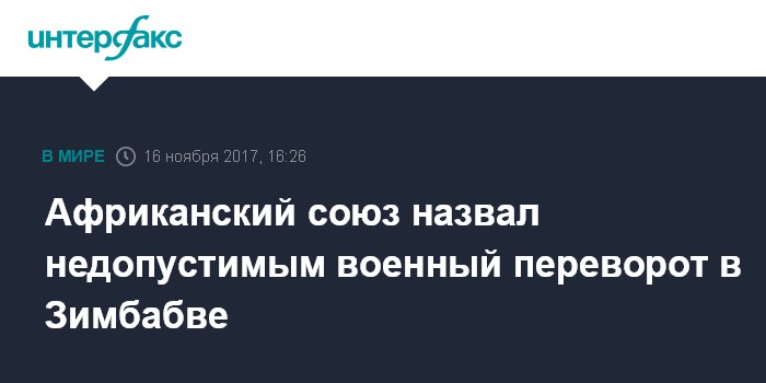 Москва. 16 ноября. INTERFAX.RU - Председатель Африканского союза Альфа Конде заявил, что организация "никогда не примет военный переворот" в Зимбабве, сообщает в четверг телеканал Sky News.