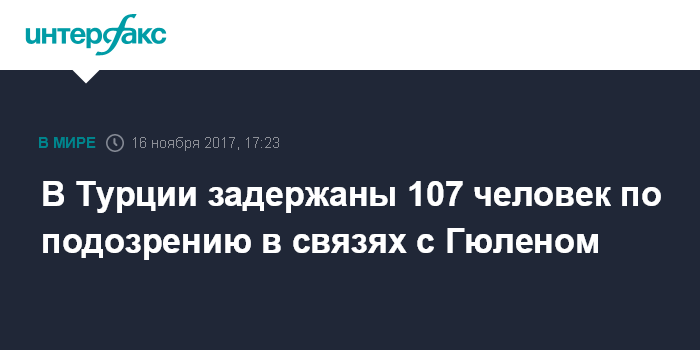Москва. 16 ноября. INTERFAX.RU - Власти Турции в четверг задержали 107 человек, в том числе 55 бывших военнослужащих, по подозрению в связях с организацией ФЕТО оппозиционного проповедника Фетхуллаха Гюлена, сообщает Анатолийское агентство новостей.