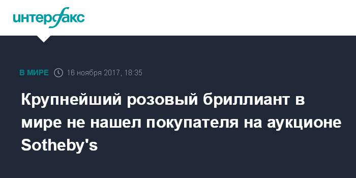Москва. 16 ноября. INTERFAX.RU - Самый большой в мире розовый бриллиант "Розовый Радж" так и не был продан на аукционе, проводившемся в Женеве домом Sotheby's, пишет CNBC.