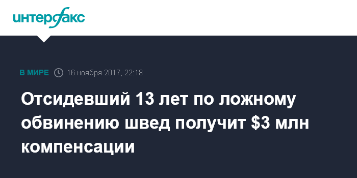 Москва. 16 ноября. INTERFAX.RU - Ошибочно осужденный за убийство и отсидевший 13 лет в тюрьме швед Кай Линна получит рекордную компенсацию в $3 млн, сообщается в четверг на ресурсе The Local.