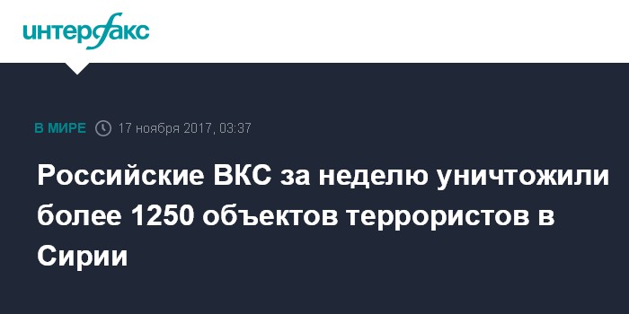 Согласно инфографике Минобороны РФ, опубликованной в официальной газете ведомства "Красная звезда", авиация ВКС РФ за неделю уничтожила более 1250 объектов международных террористических группировок на территории Сирии.