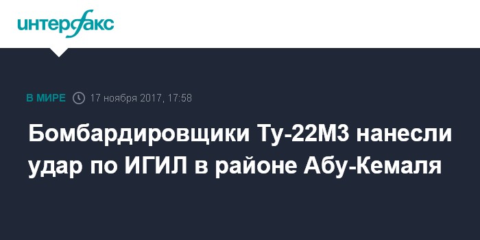 "17 ноября 2017 года шесть дальних бомбардировщиков Ту-22М3, взлетевшие с аэродрома на территории России, совершив перелет над территорией Ирана и Ирака, нанесли групповой авиационный удар по объектам террористической группировки ИГИЛ в районе города Абу-Кемаль (провинции Дейр-эз-Зор)", - заявили в Минобороны РФ.