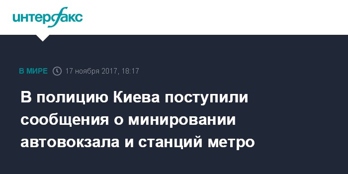 Москва. 17 ноября. INTERFAX.RU - Полиция Киева проверяет анонимные сообщения о минировании 12 объектов, а именно о заложенной взрывчатке на центральном автовокзале, телеканале, автостанции "Дарница",в шести развлекательных центрах, на станциях метро "Лыбидская" и "Святошин", а также в отеле.