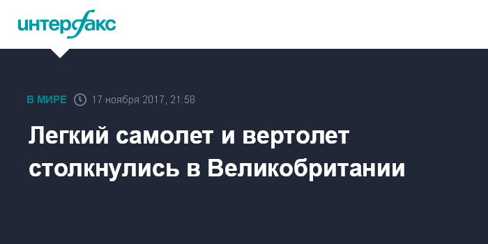 Москва. 17 ноября. INTERFAX.RU - Легкомоторный самолет столкнулся с вертолетом в небе над английским графством Бакингемшир в пригороде города Эйлсбери, пишет в пятницу The Guardian.