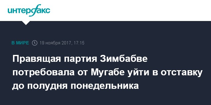 Москва. 19 ноября. INTERFAX.RU - Правящая партия Зимбабве ЗАНУ-ПФ в воскресенье выдвинула требование к президенту страны Роберту Мугабе сложить свои полномочия до полудня понедельника, сообщает британское издание The Independent со ссылкой на заявление центрального комитета ЗАНУ-ПФ.