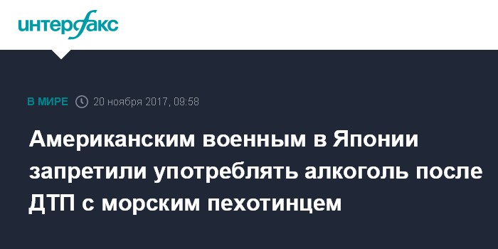 Москва. 20 ноября. INTERFAX.RU - Командование США ввело запрет на употребление алкоголя для американских военных в Японии после ДТП со смертельным исходом, в котором оказался замешанным нетрезвый морской пехотинец, передает в понедельник японский телеканал NHK.