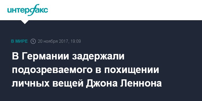 Москва. 20 ноября. INTERFAX.RU - Немецкая полиция заявила о задержании подозреваемого в похищении личных вещей британского музыканта и певца Джона Леннона, сообщает в понедельник агентство Associated Press.