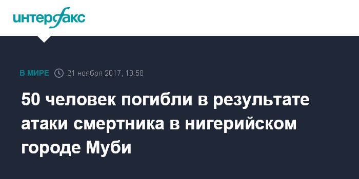 Москва. 21 ноября. INTERFAX.RU - Около 50 человек стали жертвами взрыва, который произошел во вторник в нигерийском городе Муби, сообщает американский телеканал CNN.
