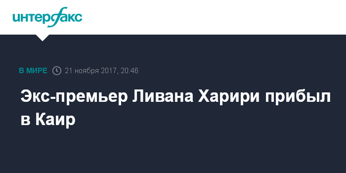 Москва. 21 ноября. INTERFAX.RU - Заявивший о намерении уйти в отставку премьер-министр Ливана Саад Харири прибыл в Каир, где проведет встречу с президентом Египта Абдель Фаттахом ас-Сиси. Об этом сообщает во вторник израильское издание Jerusalem Post.