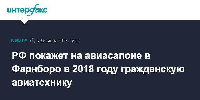 Москва. 22 ноября. INTERFAX.RU - Россия планирует представить гражданскую продукцию на авиасалоне в Фарнборо (Великобритания), сообщила "Интерфаксу" в среду руководитель пресс-службы Минпромторга РФ Залина Корнилова.