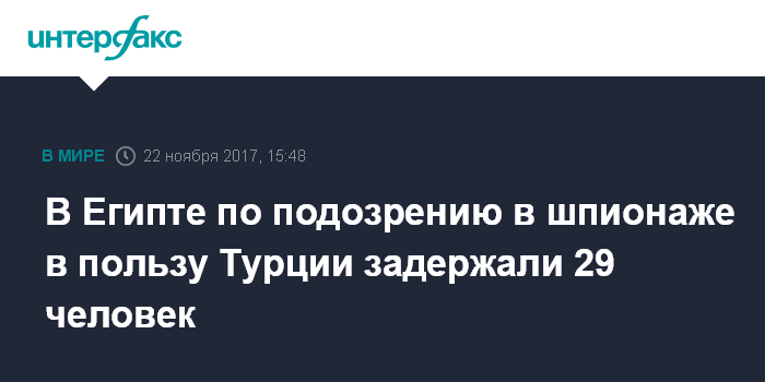 Москва. 22 ноября. INTERFAX.RU - В Египте задержаны 29 человек, подозреваемых в шпионаже в пользу Турции, а также в причастности к деятельности террористической организации, сообщает в среду египетская пресса.