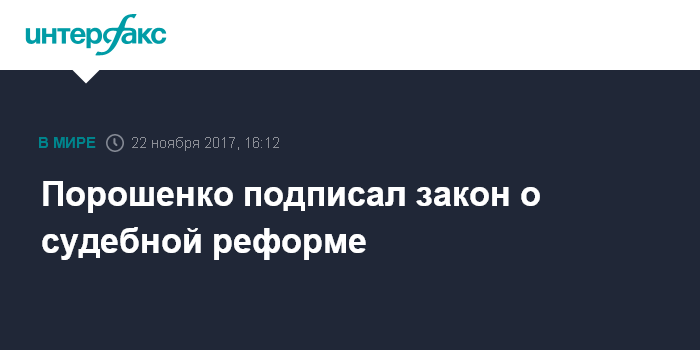 Москва. 22 ноября. INTERFAX.RU - Президент Украины Петр Порошенко подписал закон о внесении изменений в Хозяйственный процессуальный, Гражданский процессуальный кодексы, Кодекс об административном судопроизводстве Украины и другие законодательные акты, который призван обеспечить завершение судебной реформы.