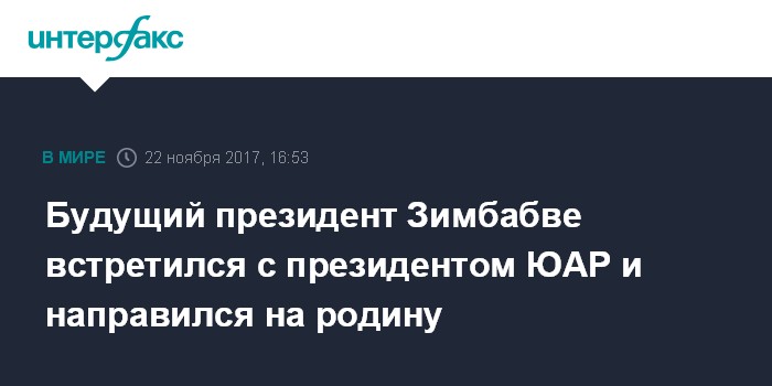 Москва. 22 ноября. INTERFAX.RU - Предполагаемый будущий президент Зимбабве Эммерсон Мнангагва, которого ранее отстранил от должности вице-президента бывший многолетний лидер страны Роберт Мугабе, встретился в ЮАР с президентом этой страны Джейкобом Зумой, сообщает в среду агентство Associated Press.