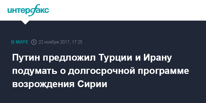 Москва. 22 ноября. INTERFAX.RU - Президент РФ Владимир Путин предложил своим коллегам из Турции и Ирана Реджепу Тайипу Эрдогану и Хасану Рухани совместно подумать над комплексной программой восстановления Сирии.