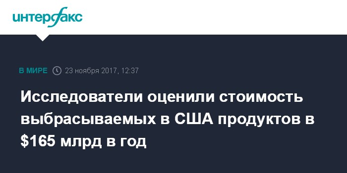 Москва. 23 ноября. INTERFAX.RU - Американцы выбрасывают до 40% покупаемой еды на сумму до $165 млрд в год, говорится в совместном исследовании Гарвардской школы права и Совета по защите природных ресурсов США. Как пишет MarketWatch, в натуральном выражении в США выкидывается около 72,5 млн тонн продуктов и пищевых отходов.