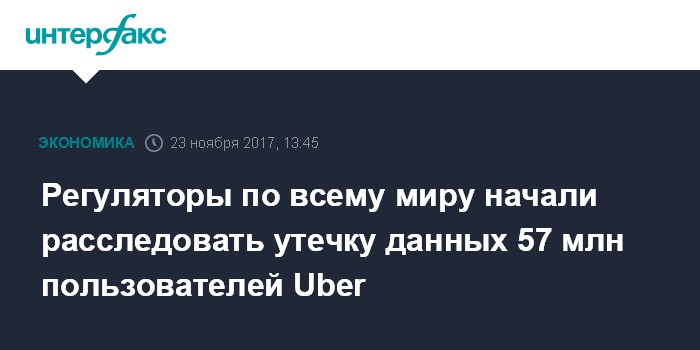Москва. 23 ноября. INTERFAX.RU - Регуляторы Австралии, Великобритании, Сингапура и США обратились к Uber Technologies за информацией об утечке персональных данных 50 млн клиентов и 7 млн водителей компании по всему миру. При этом, как пишет Ars Technica, в суды Лос-Анджелеса и Сан-Франциско уже поданы два коллективных иска потребителей против Uber в связи с утечкой данных.