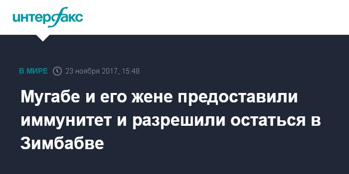 93-летний Мугабе объявил об отставке во вторник. В письме спикеру парламента Зимбабве Джейкобу Муденде он сообщил, что оставляет свой пост, чтобы обеспечить плавный переход власти. Парламент Зимбабве, где в тот же день началось заседание по импичменту Мугабе, поприветствовал такое решение. В частности, Мугабе обвиняли в том, что он "позволил своей жене узурпировать конституционную власть".