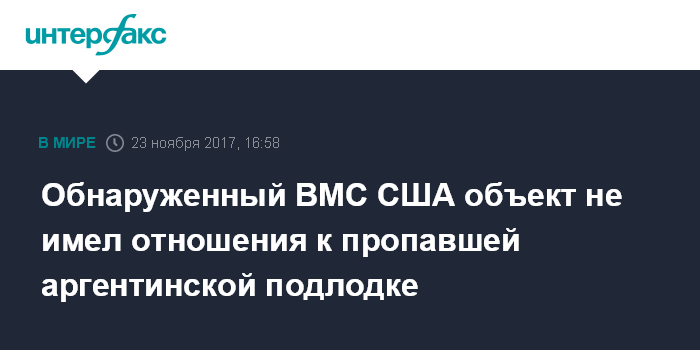 Москва. 23 ноября. INTERFAX.RU - Объект, обнаруженный военно-морскими силами США в районе, откуда в последний раз поступал сигнал с пропавшей аргентинской подлодки San Juan, оказался не разыскиваемым судном, сообщает в четверг телеканал Sky News со ссылкой на посольство США.