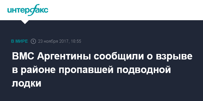 Москва. 23 ноября. INTERFAX.RU - Звук, зафиксированный в районе пропажи аргентинской субмарины San Juan, указывает на произошедший там взрыв, сообщает телеканал Sky News со ссылкой на ВМС Аргентины.