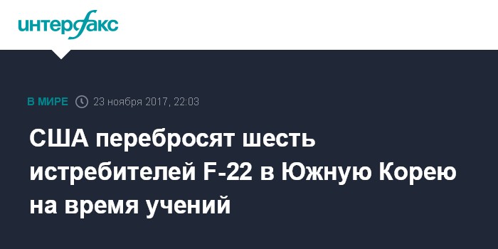 Москва. 23 ноября. INTERFAX.RU - Власти США направят в Южную Корею шесть многоцелевых истребителей F-22 для проведения совместных учений, которые состоятся в следующем месяце, передает в четверг агентство "Ренхап".