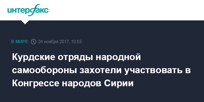 Москва. 24 ноября. INTERFAX.RU - Представители вооружённого крыла Партии демократического союза (ПДС) сирийских курдов заинтересованы в участии в Конгрессе народов Сирии в Сочи, но пока не были на него приглашены.