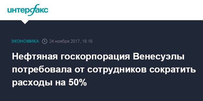 Москва. 24 ноября. INTERFAX.RU - Венесуэльская нефтяная госкорпорация Petroleos de Venezuela SA (PDVSA) потребовала от сотрудников сократить расходы и затраты на 50% на фоне экономического кризиса в стране, сообщает агентство Bloomberg, в распоряжении которого оказался соответствующий внутренний документ компании.