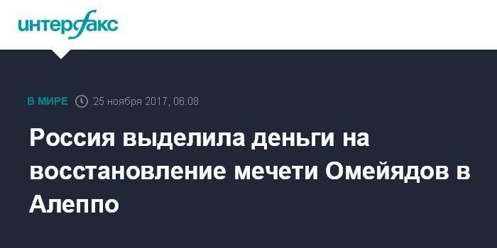 Москва. 25 ноября. INTERFAX.RU - Россия выделила средства на реставрацию и восстановление мечети Омейядов, разрушенной террористами в сирийском Алеппо, сообщил журналистам в субботу архитектор и историк Сахар Аляби.