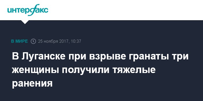 Москва. 25 ноября. INTERFAX.RU - Три женщины госпитализированы с тяжелыми ранениями в результате взрыва ручной гранаты в Луганске, сообщил представитель МЧС самопровозглашенной Луганской народной республики Константин Дахненко.