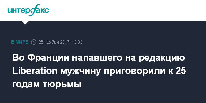 Москва. 25 ноября. INTERFAX.RU - Французский суд приговорил к 25 годам тюремного заключения мужчину, открывшего стрельбу в офисе газеты Liberation ("Либерасьон") в Париже в 2013 году, сообщают в субботу французские СМИ.