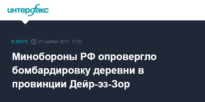 Москва. 27 ноября. INTERFAX.RU - В Минобороны России опровергли информацию, появившуюся в зарубежных СМИ со ссылкой на расположенную в Великобритании "Обсерваторию по правам человека в Сирии", о нанесении самолетами ВКС России ударов по деревне Аль-Шафах в провинции Дейр-эз-Зор .