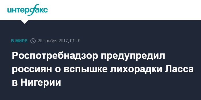 Москва. 28 ноября. INTERFAX.RU - Несколько десятков из более чем 600 заболевших скончались от лихорадки Ласса в Нигерии, сообщили в пресс-службе Роспотребнадзора со ссылкой на центр по контролю за заболеваниями (ЦКЗН) этой западно-африканской страны.