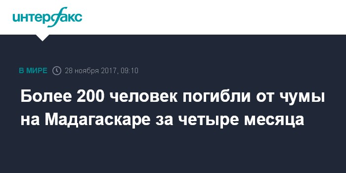 Всемирная организация здравоохранения (ВОЗ) в понедельник заявила, что число погибших от самой сильной за последние 50 лет вспышки чумы на Мадагаскаре с 1 августа по 22 ноября составило 202 человека. Более 2,34 тыс. человек заражены.