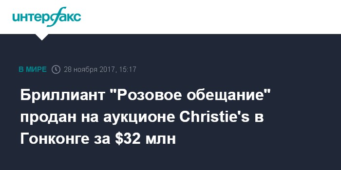 Москва. 28 ноября. INTERFAX.RU - Крайне редкий розовый бриллиант "Розовое обещание" (Pink Promise) весом 14,93 карата был продан на аукционе Christie's в Гонконге за $31,86 млн, пишет Forbes.
