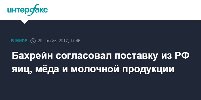 Москва. 28 ноября. INTERFAX.RU - Бахрейн согласовал ветсертификаты на поставку из РФ яиц, мёда и молочной продукции, сообщили во вторник в Россельхознадзоре.