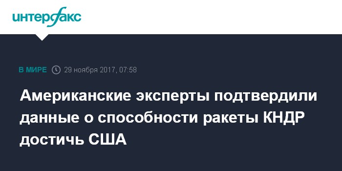 Москва. 29 ноября. INTERFAX.RU - Эксперты американского Союза обеспокоенных ученых считают соответствующим действительности заявление Пхеньяна о том, что новая межконтинентальная ракета, пуск которой был осуществлен накануне, способна поражать цели на всей территории США.