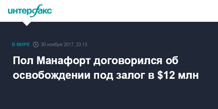 Москва. 30 ноября. INTERFAX.RU - Бывший глава избирательной кампании президента США Дональда Трампа Пол Манафорт, обвиняемый в отмывании денег, смог договориться с прокурорами об освобождении под залог, сообщает агентство Bloomberg.