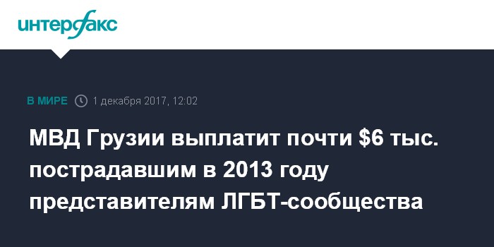 Москва. 1 декабря. INTERFAX.RU - Около 20 представителей грузинских секс-меньшинств, подвергшихся нападению в ходе акции 2013 года в центре Тбилиси, по решению Верховного суда получат от Министерства внутренних дел компенсацию в размере 15,5 тысячи лари ($5740 - ИФ), сообщают в пятницу местные СМИ.