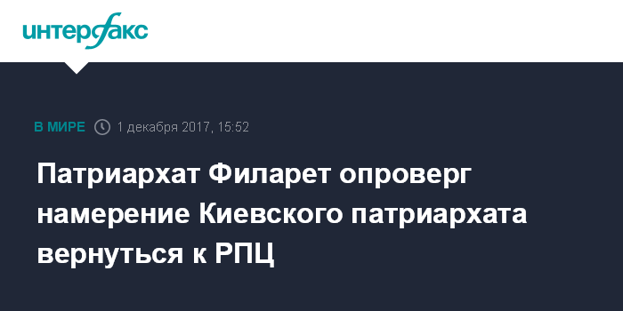 Москва. 1 декабря. INTERFAX.RU - Глава самопровозглашенного Киевского патриархата (УПЦ-КП) Филарет (Денисенко) опроверг намерение не признанной канонически украинской церкви вернуться к Московскому патриархату.