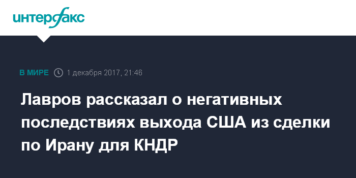 Москва. 1 декабря. INTERFAX.RU - Возможный выход Вашингтона из соглашения по иранскому атому создаст негативный прецедент в контексте урегулирования ситуации вокруг ядерной программы КНДР, заявил глава МИД РФ Сергей Лавров.
