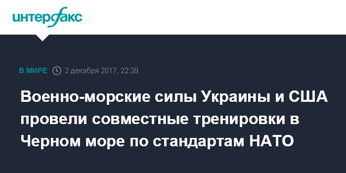 Москва. 2 декабря. INTERFAX.RU - Военно-морские силы (ВМС) Украины провели совместные тренировки типа PASSEX с эсминцем ВМС США "Джеймс Уильямс", сообщили в пресс-центр командования ВМС Вооруженных сил страны (ВСУ).