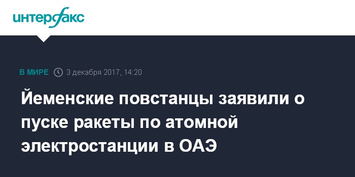Москва. 3 декабря. INTERFAX.RU - Йеменские повстанцы объявили, что они выпустили крылатую ракету по строящейся АЭС "Барака", которая возводится на западе Объединенных Арабских Эмиратов вблизи границы с Саудовской Аравией, сообщает в воскресенье агентство Associated Press.