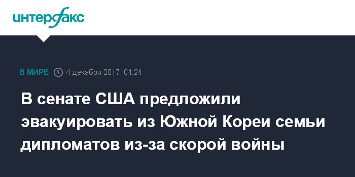 Москва. 4 декабря. INTERFAX.RU - Американский сенатор Линдси Грэм, считает, что в связи с неизбежностью близкого вооруженного конфликта следует эвакуировать из Южной Кореи жен и детей сотрудников представительств США.