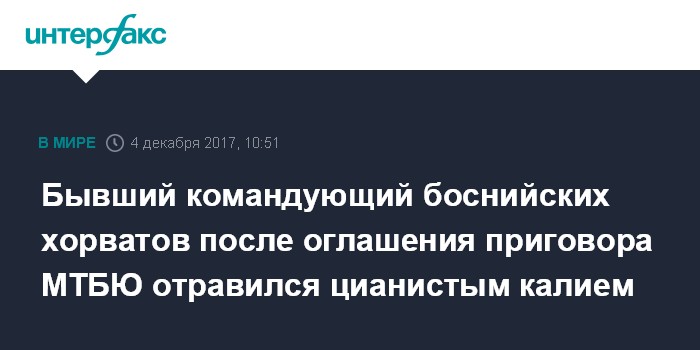 Бывший командующий боснийских хорватов после оглашения приговора МТБЮ отравился цианистым калием