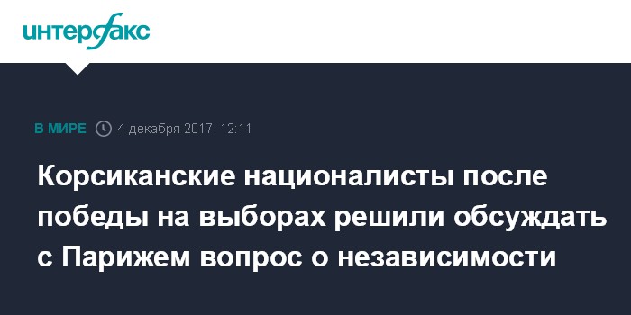 "Мы хотим, чтобы Париж согласился начать диалог, признав, что корсиканский вопрос имеет не только социальную и культурную значимость, но и политическую", - сказал лидер корсиканских националистов, отметив, что результаты первого тура стали "демократическим цунами".