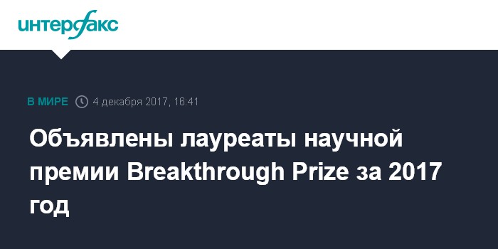 Москва. 4 декабря. INTERFAX.RU - Объявлены лауреаты премии Breakthrough Prize, учрежденной российским предпринимателем Юрием Мильнером, сообщает сайт N+1.