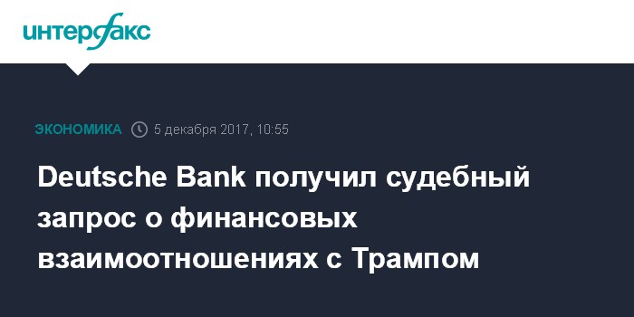 Москва. 5 декабря. INTERFAX.RU - Немецкий Deutsche Bank получил официальный судебный запрос от спецпрокурора США Роберта Мюллера, расследующего возможные связи президента США Дональда Трампа с Россией, о финансовых взаимоотношениях с американским лидером, сообщили источники агентства Bloomberg.