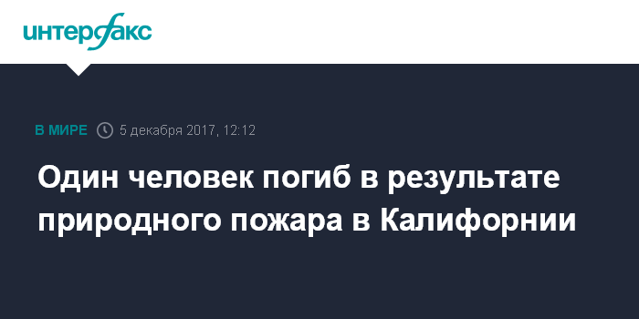 Москва. 5 декабря. INTERFAX.RU - Один человек стал жертвой природного пожара, охватившего более 12 кв км на юге американского штата Калифорния. Об этом сообщило во вторник пожарное отделение округа Вентура.