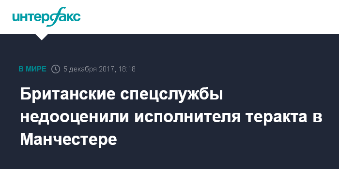 Москва. 5 декабря. INTERFAX.RU - Служба безопасности Великобритании (МI5) интересовалась организатором теракта в Манчестере Салманом Абеди до атаки и должна была обсудить необходимость дальнейшего расследования по нему в конце мая, через девять дней после атаки, сообщает Sky News со ссылкой на доклад юриста Дэвида Андерсона.